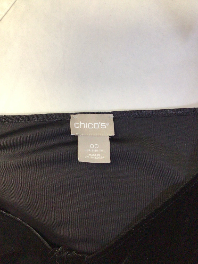 Black, velvet texture, short sleeve top with a twist on the neckline.