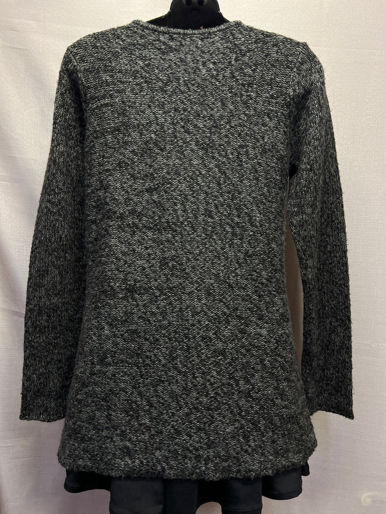 Black & gray knit blend tunic sweater with long sleeves and small v-neck.