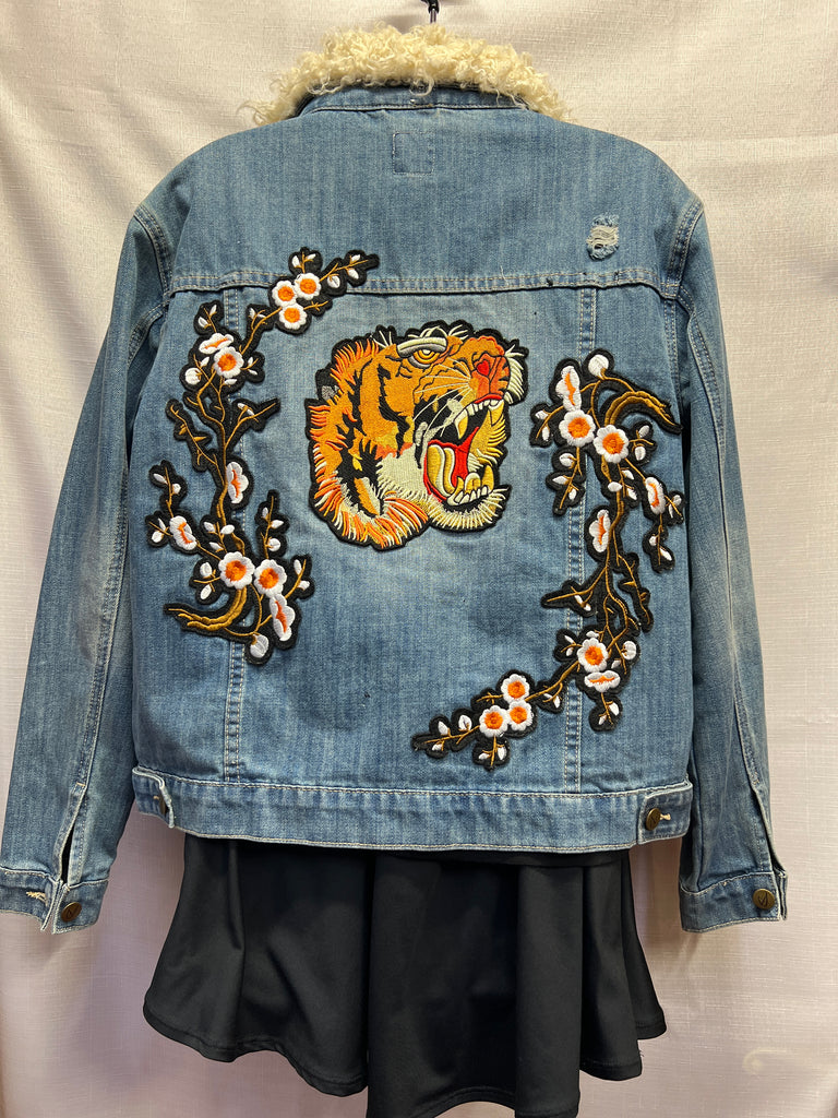 Denim jacket with faux shearling collar and a tiger embroidered patch design in the back.