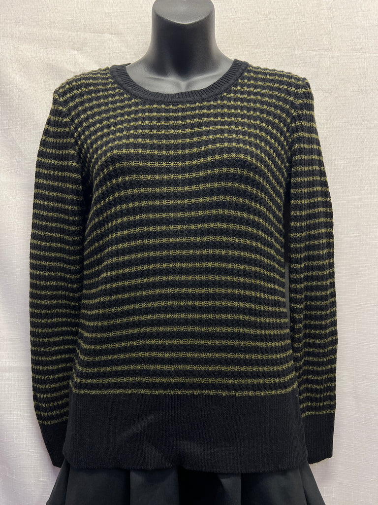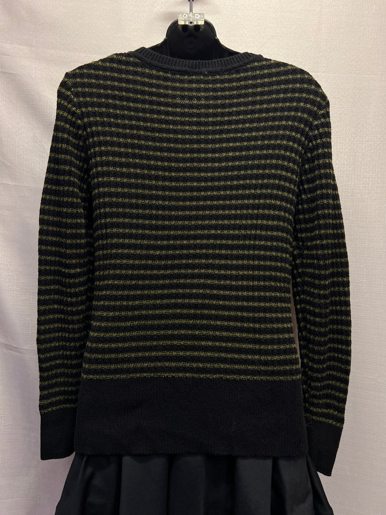 Black and green horizontal stipes, long sleeves, knit sweater.