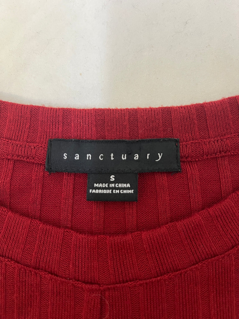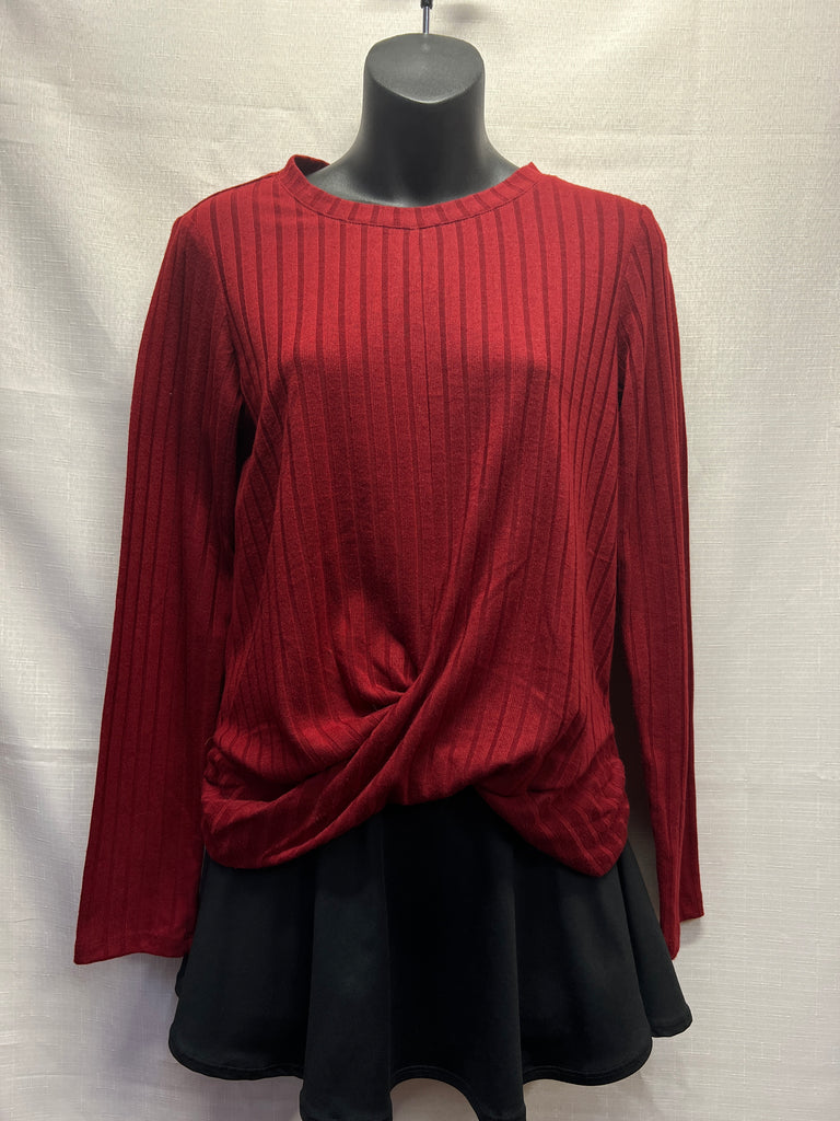 Red long sleeve top with fabric twist at bottom. Ribbed