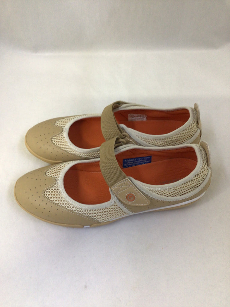 Tan and beige slip on shoes with velcro strap in the middle. Orange interior.