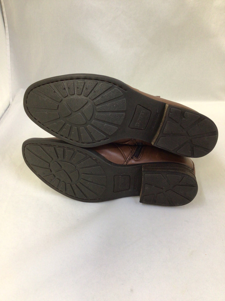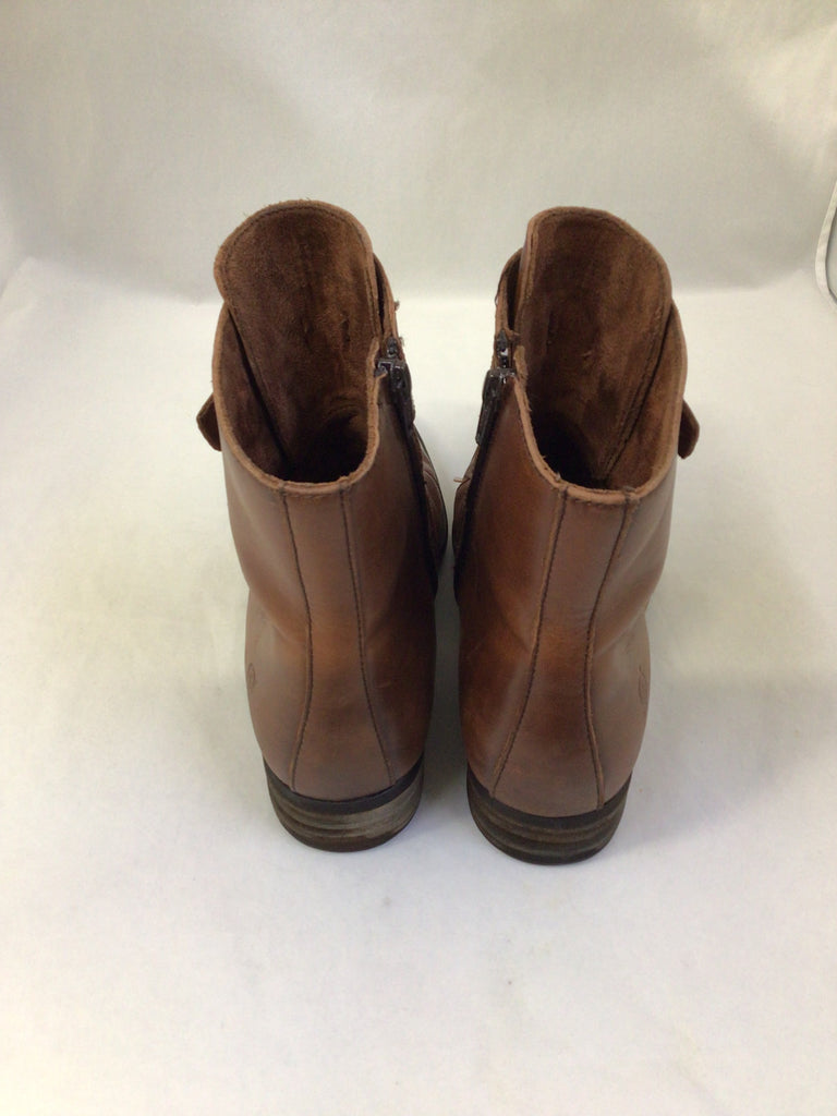 Light brown, leather booties with four buckles across the front. Side zipper and small heels.