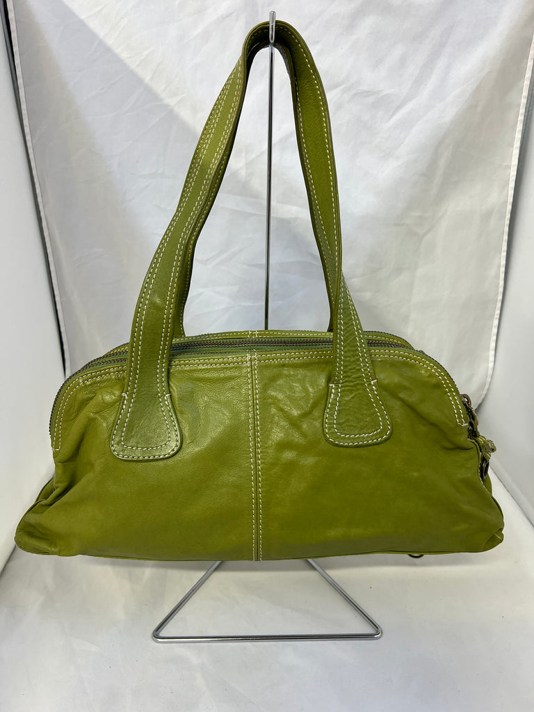 Green leather purse with three main zipper pockets. Shoulder purse with pink base interior and yellow, blue and pink floral designs.