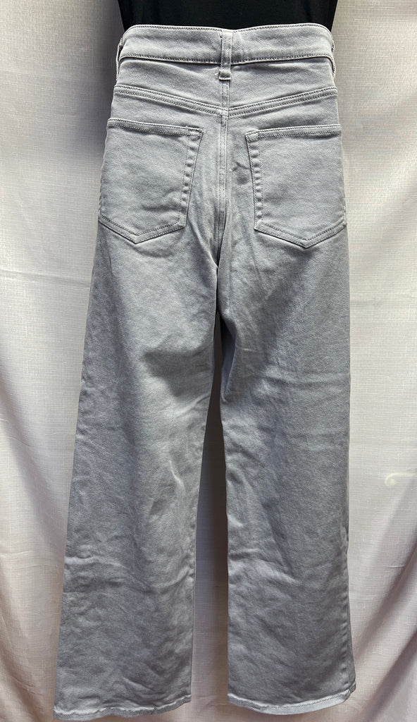 Light gray, high waisted and wide leg jeans.