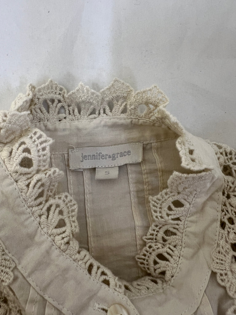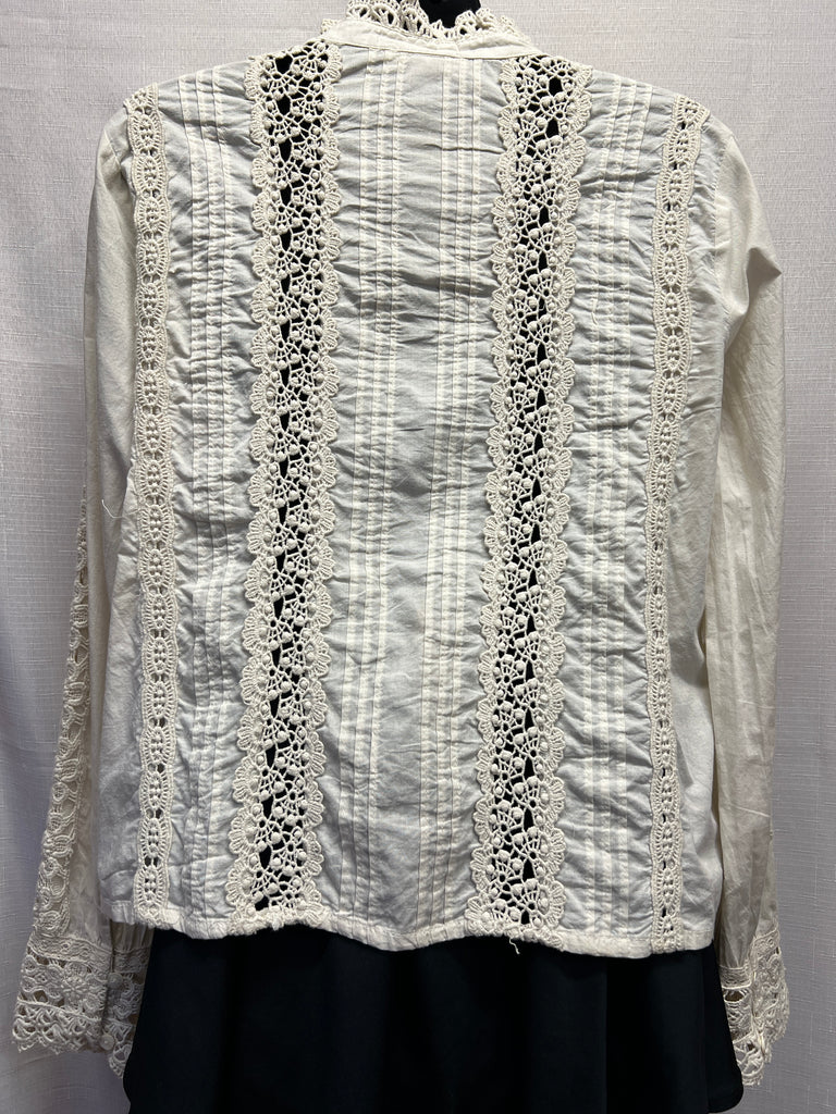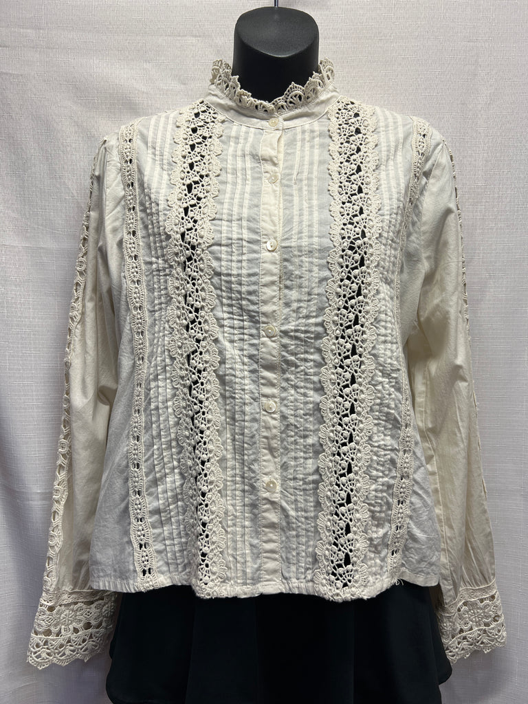 Beige, long sleeve, button up top with floral lace on sleeves.
