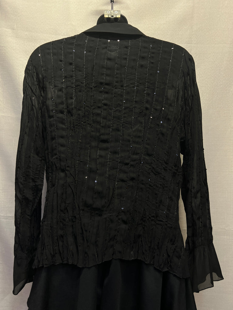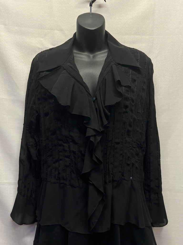 Black sheer long sleeve top with worn out pleats, ruffles on v-neck and sequins all over. Button down.