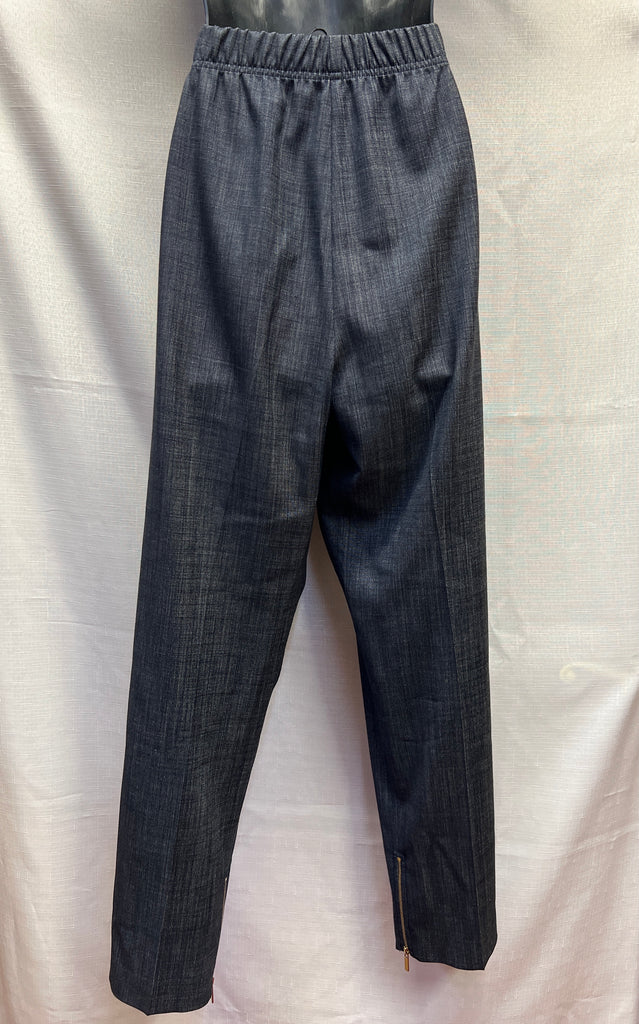 Dark blue, pull up pants with pockets.