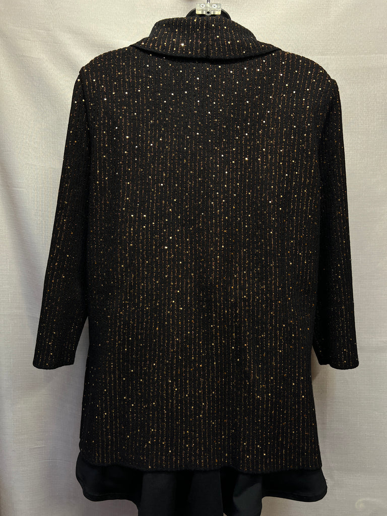 Black, knitted sweater with brown tinsel and gold sequin squares. Elbow length sleeves with a cowl neck.